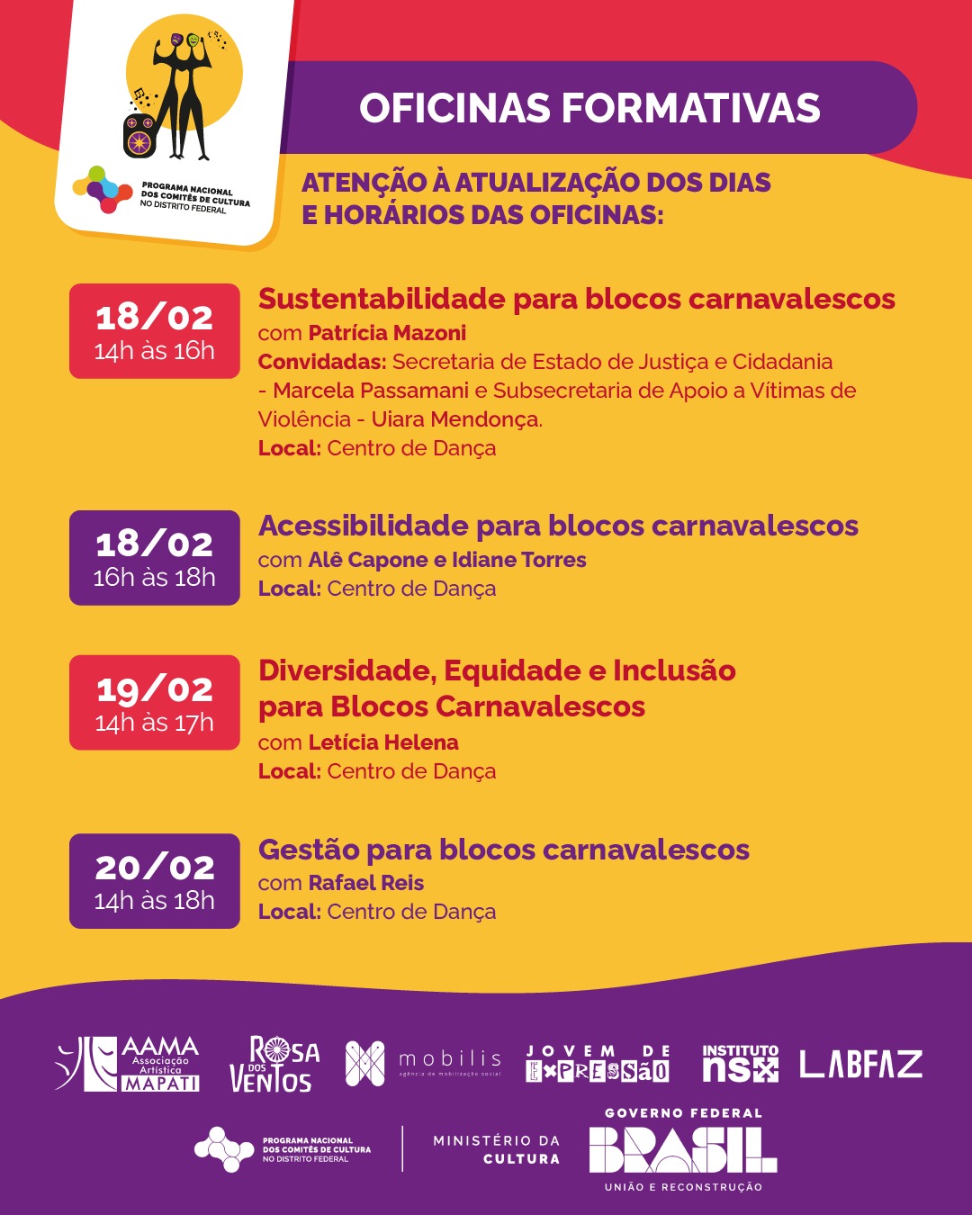 Oficina ministrada por Rafael Reis, com fim de ensinar e instruir sobre a gestão e realização de projetos carnavalescos. Atividade aconteceu no Centro de Dança com 28 produtores culturais carnavalesco e duração de 4 horas.
